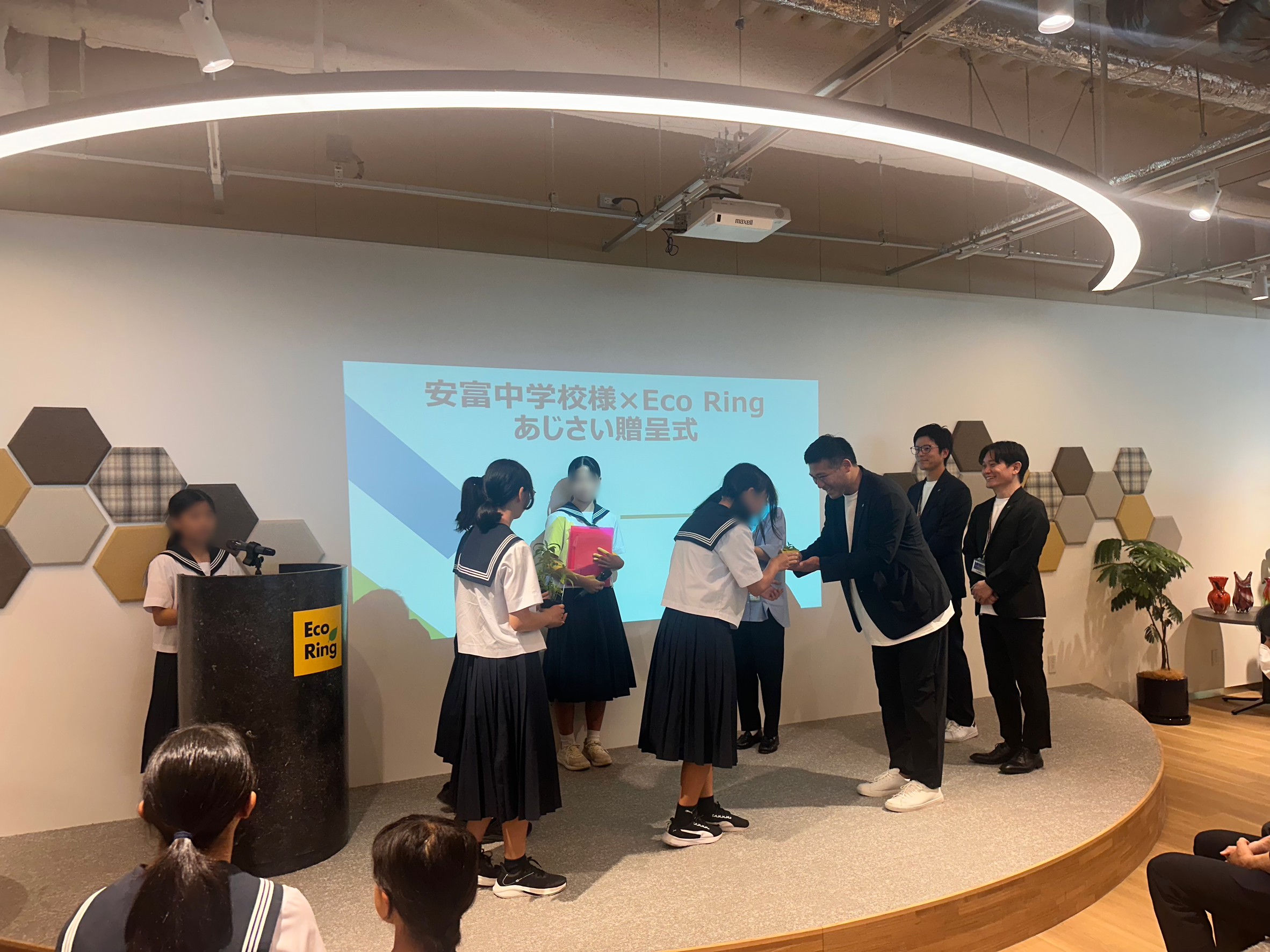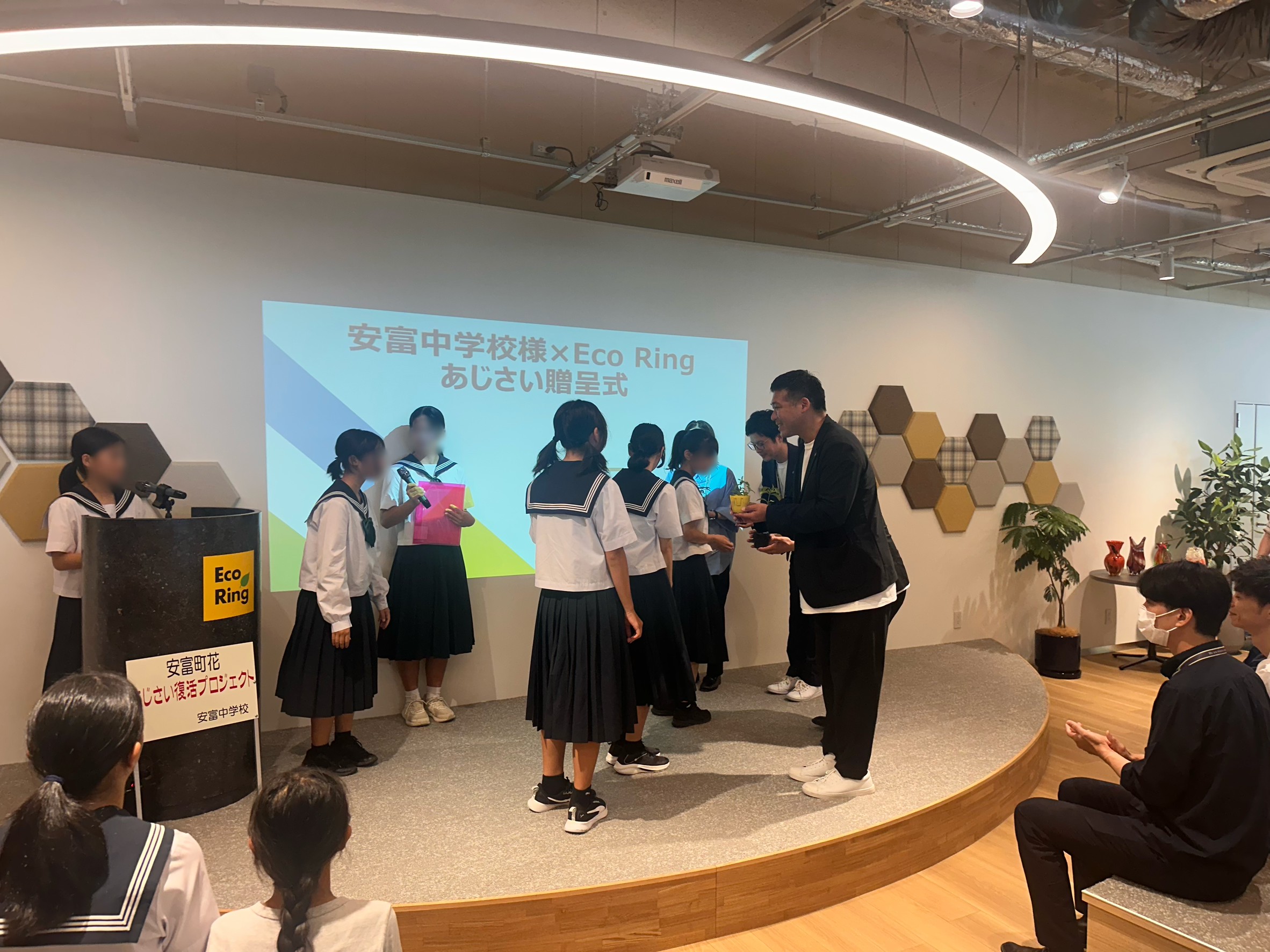 イベントの冒頭では、生徒代表の司会進行のもと、アジサイ贈呈式が行われました。安富中学校の生徒の皆さまからは、心を込めて育てられたアジサイの苗を、エコリングにご寄贈いただきました。