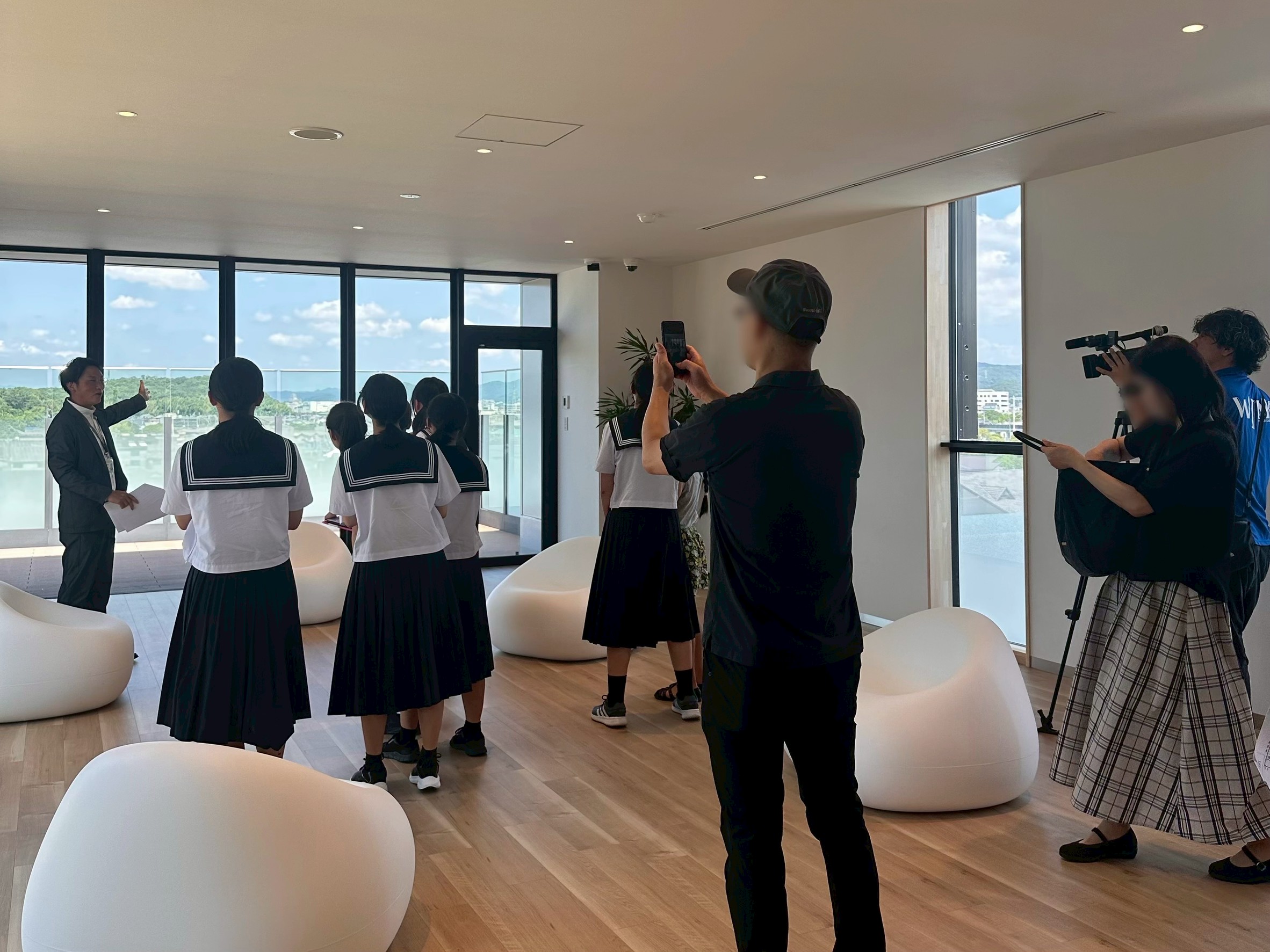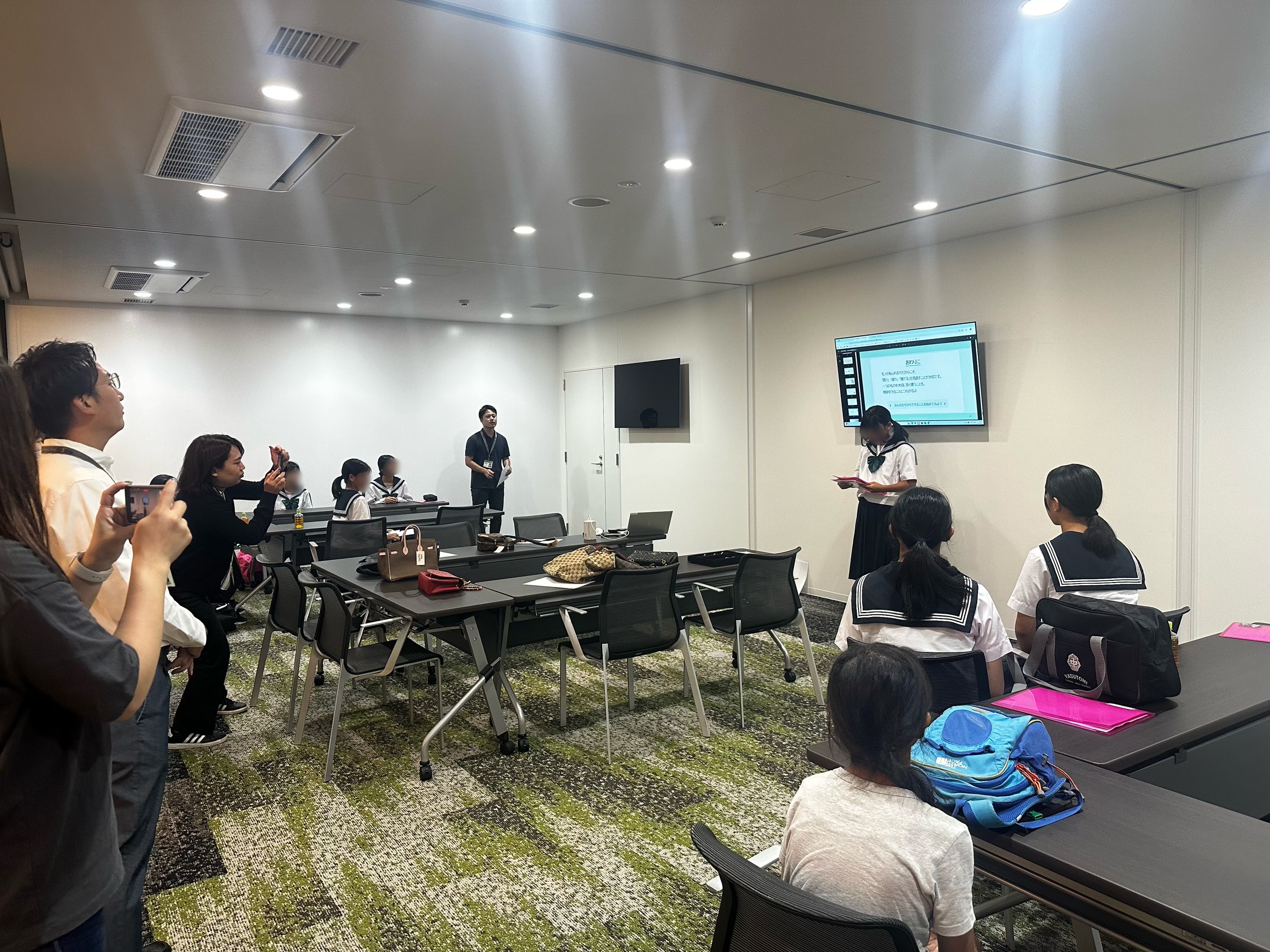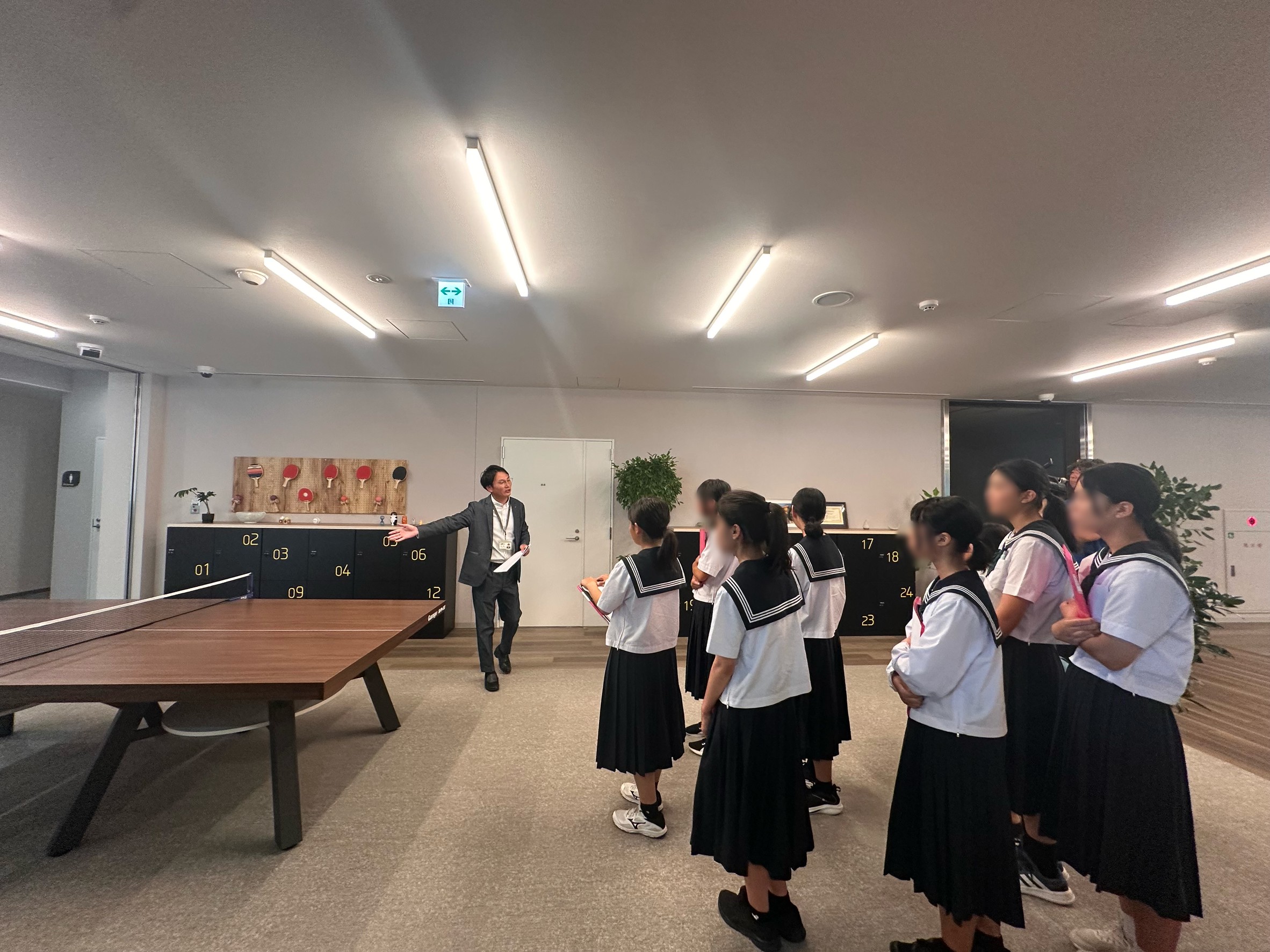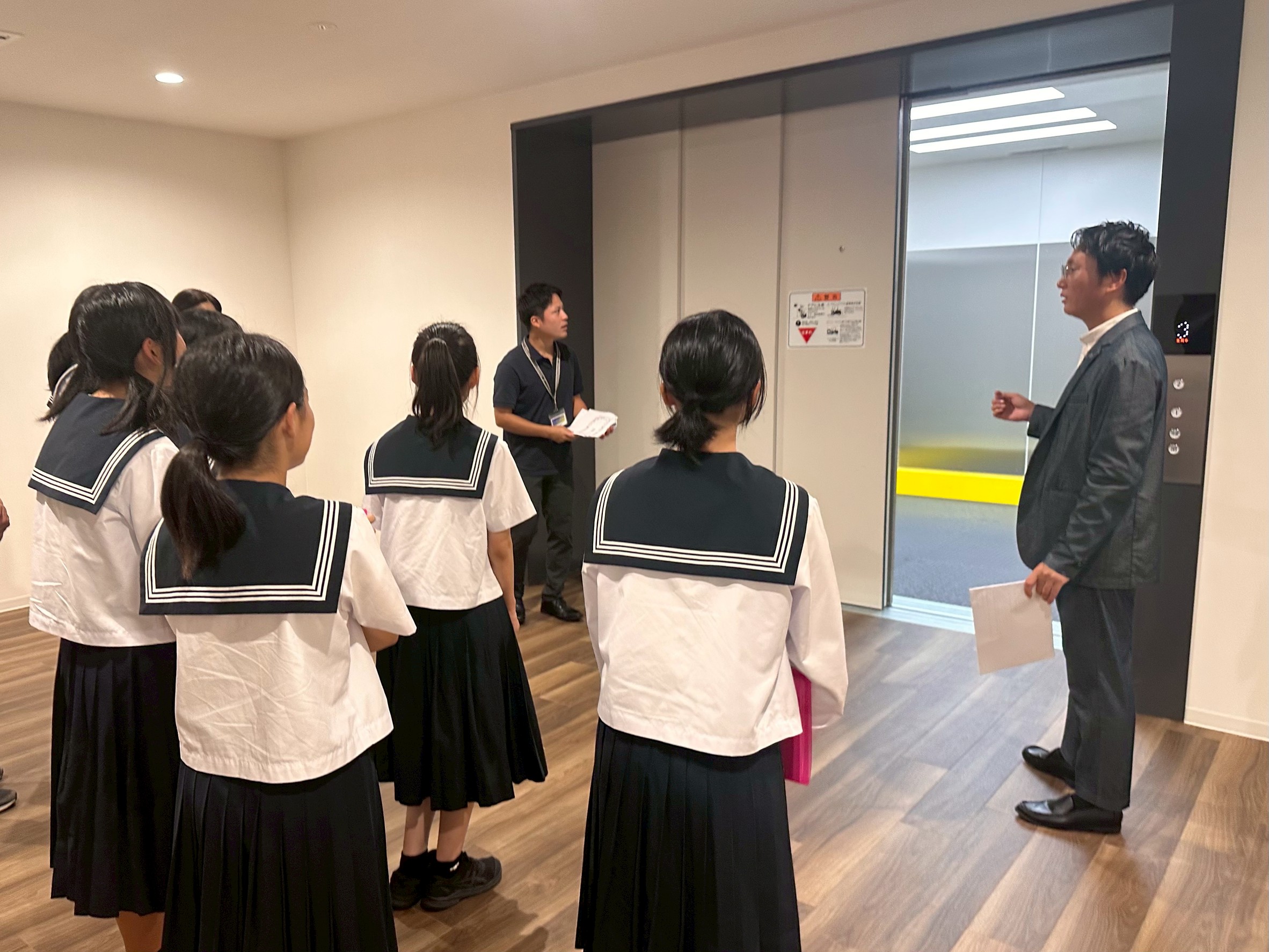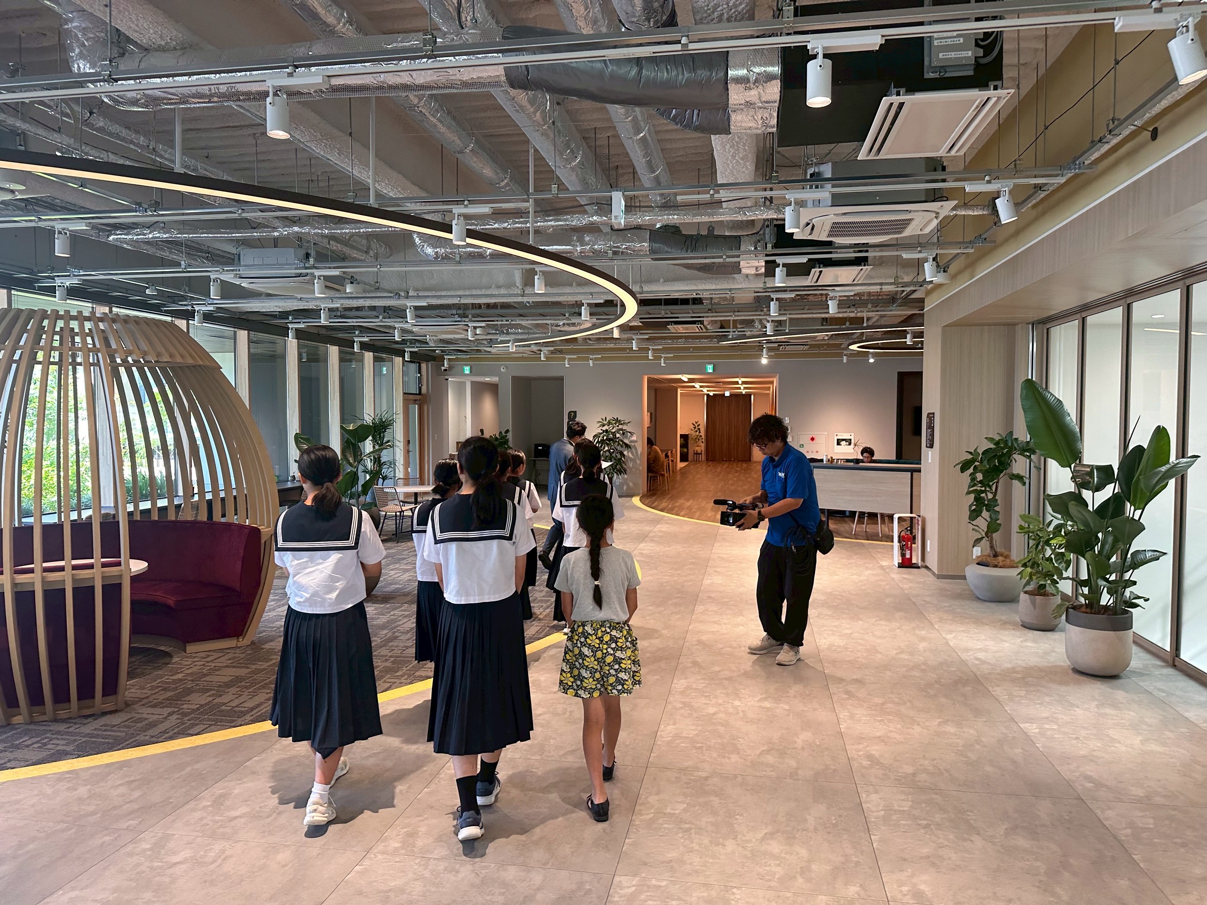 贈呈式の後は、オフィス内の見学ツアーを実施。各フロアでは社員が業務内容や工夫を紹介し、生徒の皆さんは真剣なまなざしで耳を傾けてくださいました。実際に働いている現場を見て感じて、当社への関心を深めていただく貴重な機会となりました。