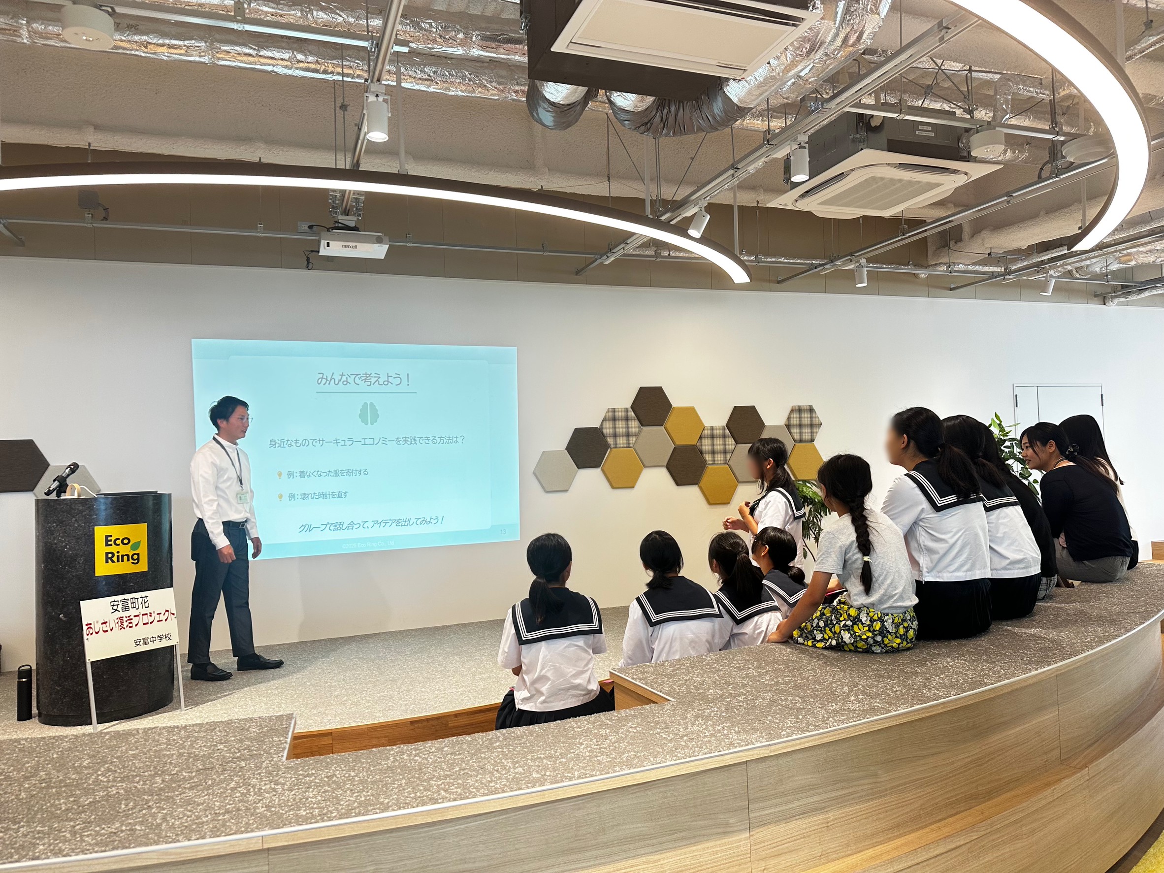 サステナビリティ推進部より、サーキュラーエコノミーに関する講義を行いました。環境課題の現状や、リユースがもたらす社会的インパクトについて、事例を交えながらお伝えしました。 講義の終盤には、生徒、先生と社員が一緒になって「身近にできるサーキュラーアクション」について意見を出し合い、発表が行われました。