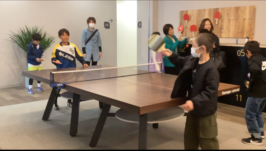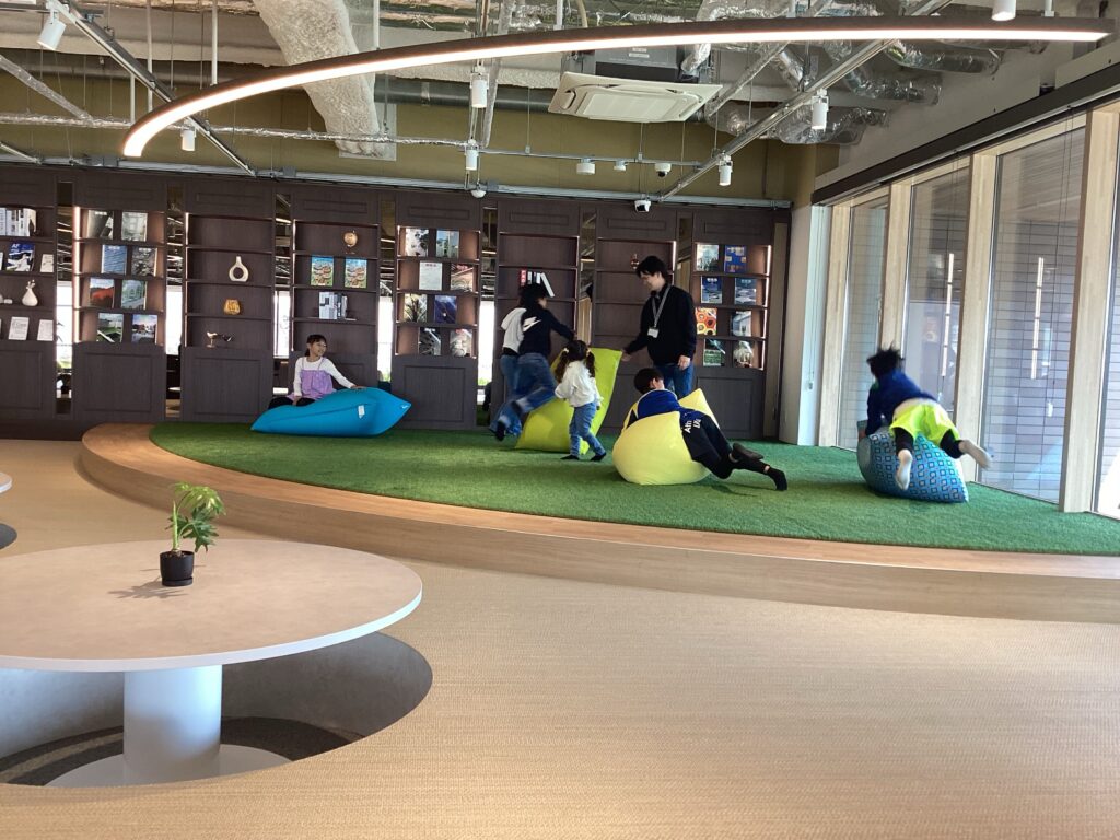 また、社員のリフレッシュスペースとして設けられた3Fには、卓球台やけん玉、ビーズクッション、ハンモックなども設置されており、お子様たちも保護者の方と一緒にのびのびと楽しんでいました。4Fの無人コンビニでは、ピクニック気分でおやつタイムを満喫する姿も見られました。