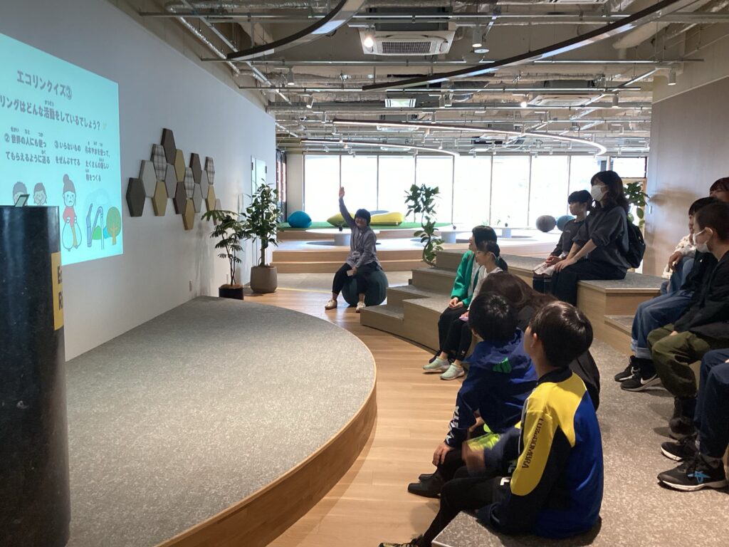 新本社の見学を終えたあとは、3Fのリングステージで、エコリングの事業やリユースの仕組み、環境課題について楽しく学べるクイズ大会を開催しました。
